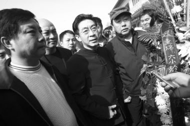 上午10點(diǎn)告別儀式開始,人們排成長隊(duì)井然有序地進(jìn)入靈堂。閆懷禮的遺體安臥在花叢中,面容安詳!吧窕觌x去芳名百世著清風(fēng),音容宛在勤奮一生傳佳話”的挽聯(lián)十分醒目。靈柩旁,六小齡童、遲重瑞、馬德華等《西游記》主創(chuàng)垂淚站立。當(dāng)《西游記》主題曲《敢問路在何方》在靈堂響起,眾人嗚咽聲一片。