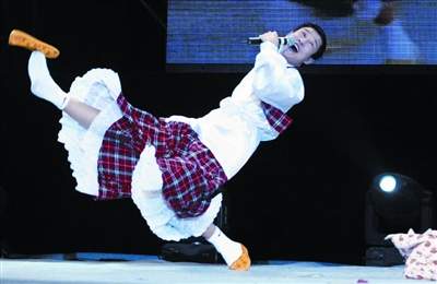 經(jīng)過近2小時(shí)的“溫場(chǎng)”后,小沈陽終于壓軸登臺(tái)亮相。一看到身穿標(biāo)志性的紅格子“蘇格蘭”服,背著小挎包的小沈陽從后臺(tái)走出來時(shí),觀眾紛紛尖叫著起立。久候在舞臺(tái)邊的一群女粉絲手捧鮮花,欲沖過保安防線上前獻(xiàn)給偶像。“對(duì)我的粉絲要客氣哦!”小沈陽金口一開,粉絲們立即突破了防線沖上臺(tái)去,有女粉絲獻(xiàn)過花后再來一個(gè)熊抱,后面的女粉絲更是“搶吻”小沈陽,“陽仔(小沈陽小名)我愛你”的真情表白更在劇場(chǎng)內(nèi)此起彼伏,看來小沈陽的“女人緣”極好。