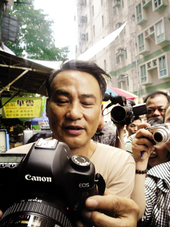 昨天的拍攝地點叫永利街。那是很窄的一條街道,其中一邊已經(jīng)改造成了高樓,另一邊則保留了一些舊樓。劇組在舊樓這邊搭了些鐵架和舊式廣告招牌,營造上世紀60年代的氣氛。導演羅啟銳介紹:“這條街是香港最后一條60年代老街了,本來已經(jīng)要拆掉,但是政府為了關照我們,特意推遲到我們拍完再拆。我們用這條街來重現(xiàn)當年的深水埗!备邩谴髲B的存在有時挺影響拍攝,“經(jīng)常穿幫,要靠后期特效來消除”。據(jù)說,導演小時候就住在這里。