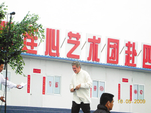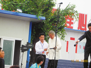 雖然本次“心連心”藝術團在明星陣容上創(chuàng)下了空前的紀錄,但是劇組在籌備過程中卻是對成本極盡節(jié)約。昨日早上6點半,記者提前來到演出現場,碩大一個舞臺就搭建在板房區(qū)的一個空地上,舞臺背景也是就地取材,由幾間貼著大紅對聯的板房組成,但看著特別的溫暖。