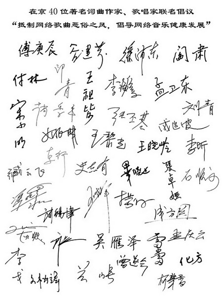 中國音樂家協(xié)會19日在京召開“抵制網(wǎng)絡(luò)歌曲惡俗之風”座談會,與會代表痛批了以《那一夜》、《大連站》、《狼愛上羊》等為代表的網(wǎng)絡(luò)歌曲低俗化現(xiàn)象,同時,以閻肅等為代表的在京40位著名詞曲作家、歌唱家聯(lián)名發(fā)起了“抵制網(wǎng)絡(luò)歌曲惡俗之風,倡導(dǎo)網(wǎng)絡(luò)音樂健康發(fā)展”倡議書。