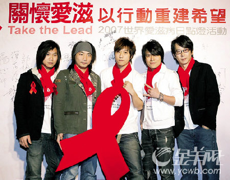 搖滾樂團五月天前天來到臺北101為2007世界艾滋病日點燈活動獻唱,并與臺灣知名棒球選手王建民一起點亮臺北101外墻上的紅絲帶,與世界同步關(guān)懷艾滋病患者,傳遞愛心!(晨曉)