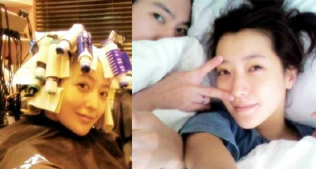 5日下午,金喜善把清晨剛醒時與丈夫一起躺在床上的照片放到了自己的“迷你小窩”博客中。照片中的金喜善雖然是一幅還沒睡醒的面容,嘴角卻掛著甜美的微笑。她在留言里撒嬌地說:“被電話鈴聲催醒了。本來可以再睡一會兒的……”,讓人忍俊不止。