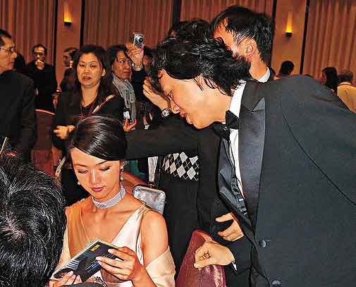李云迪對湯唯大獻殷勤,在慶功宴上經常留意她,明顯對她很有好感,記者問李云迪有沒有看《色》片?他面露尷尬說:“有,但我是看內地版(編注:該版本刪剪了三場情欲戲)!碑斃钤频峡匆姕▽⑵渥钚翪D拿在手中時,他也笑逐顏開。