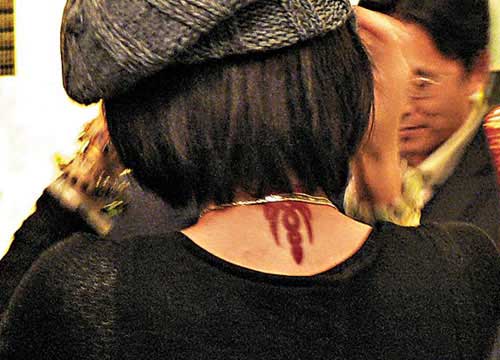 當(dāng)記者發(fā)現(xiàn)她頸部的紅色刺青,她嬌羞地說:“你發(fā)現(xiàn)了啊?這對我來說意義非常深遠(yuǎn)!痹瓉磉@字是齊秦所經(jīng)營的經(jīng)紀(jì)公司的logo,是“齊”的古字,可見她烙印的“意義”有多深遠(yuǎn)。