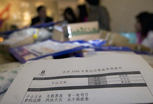 中新網(wǎng)3月12日電 據(jù)北京奧運(yùn)會(huì)官方網(wǎng)站消息,昨天是第四屆北京2008年奧運(yùn)會(huì)歌曲征集評(píng)選活動(dòng)截止的日子,也成為眾多名家和普通百姓提交自己作品的高潮。記者下午在北京2008年奧運(yùn)會(huì)歌曲征集辦公室看到,僅僅今天收到的作品已經(jīng)堆積如山,而這里的工作人員正忙于整理剛剛收到的作品。在這些作品當(dāng)中,記者赫然發(fā)現(xiàn)了“周杰倫”、“林夕”、“方文山”、“小柯”等熟悉的名字。