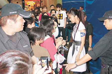 中新網(wǎng)3月20日電 薛凱琪早前在香港旺角朗豪坊活動(dòng)遇襲,前額被瓶擊致凹陷,昨天重回遇襲現(xiàn)場(chǎng),由3名保安員成“品字陣”和舅父護(hù)航,可惜聲勢(shì)大不如前,全被新秀Janice Man蓋過(guò),她即主動(dòng)破陣上前握手簽名挽人氣!
