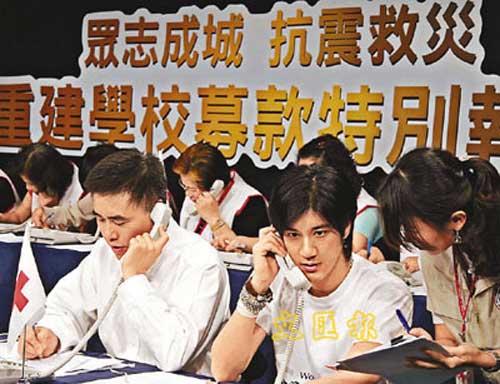 中新網(wǎng)5月19日電 據(jù)香港《文匯報(bào)》報(bào)道,臺(tái)灣藝人舉辦籌款賑災(zāi)晚會(huì) “眾志成城抗震救災(zāi),重建學(xué)校募款特別報(bào)道”節(jié)目,于前晚播出。歷經(jīng)4個(gè)小時(shí)的募款,共募得3千9百多萬元。適逢當(dāng)晚是王力宏32歲生日,對(duì)有份到場(chǎng)演出的Leehom來說特別有意義。