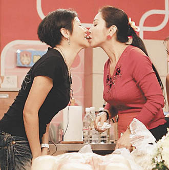 藍(lán)心湄(左)為陳美鳳慶生,兩人在錄影現(xiàn)場(chǎng)“玩親親”。
