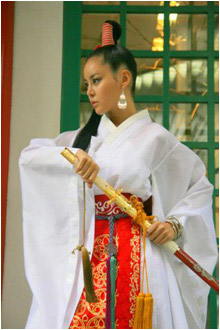 看到這張照片的網(wǎng)民紛紛指出:“雖說這款服裝是以韓國女戰(zhàn)士為主題設計的,但看上去帶有濃郁的日本風。服裝讓人聯(lián)想起和服,發(fā)型也是日本武士風格。”