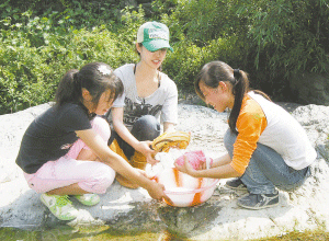 下午蔡依林又出發(fā)趕往朝天區(qū)羊木鎮(zhèn)白云村看望那里的受災(zāi)孩子。帳篷里,一名12歲的小男孩李糕引起了Jolin的注意,他小小年紀(jì)便包攬了家里的家務(wù),洗衣、做飯的同時(shí)還不忘努力學(xué)習(xí)。蔡依林讓小李糕拿出自己的語文課本,選他自己最喜歡的課文教她念,李糕選了一首唐詩,似模似樣當(dāng)起了老師。隨后,蔡依林又鉆進(jìn)了一頂帳篷。再次出來時(shí),身旁多了兩個(gè)女孩子,其中一個(gè)還拿著幾件臟衣服。一行人居然來到鄉(xiāng)間的小溪邊,蔡依林和兩個(gè)女孩子便在清澈的溪水中洗衣服。別看平時(shí)蔡依林嬌生慣養(yǎng),還留著漂亮的水晶指甲,可是做起家務(wù)活來一點(diǎn)不含糊,讓人刮目相看。不過,在搭建帳篷時(shí),身材嬌小的她卻搞不定。一旁的工人教了她半天,這才終于搭起了一頂。