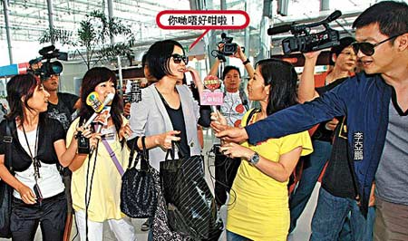 帶備多箱酒送給嘉玲的李亞鵬,與王菲及靖童于昨晨10時半左右出現(xiàn)曼谷機場,隨即引起大混亂,10多名記者及3間電視臺攝制隊將王菲重重包圍,又將麥克風遞向王菲她講兩句,她卻說:“我趕時間了!”