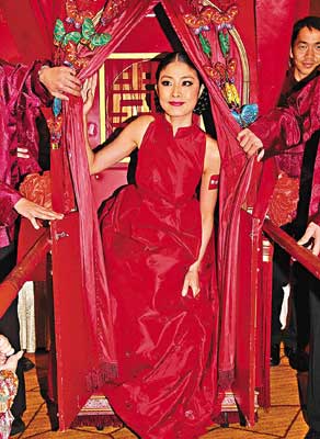 陳慧琳昨以新嫁娘打扮,乘轎進(jìn)場(chǎng)為喜餅廠商宣傳。