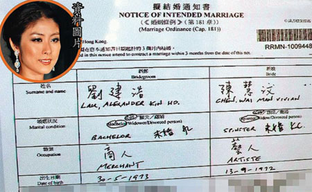 中新網(wǎng)9月17日電 香港媒體報(bào)道,陳慧琳(Kelly)和未婚夫劉建浩(Alex)拍拖16年,終于結(jié)束愛情長跑,兩人將于下月2日拉埋天窗,并于洲際酒店筵開55席宴請親朋。昨日在金鐘婚姻登記事務(wù)及紀(jì)錄辦事處,張貼了Kelly和Alex的擬結(jié)婚通知書,當(dāng)中寫上Kelly的真名“陳慧汶”及她身份證原用的英文名“Vivian”,而原來Alex的英文全名是“Alexander”,不過多年來外界已習(xí)慣簡稱他做“Alex”。通知書上也列出Kelly和Alex的出生日期,Kelly是72年9月,而Alex則是73年5月,Alex比Kelly差不多小一年。