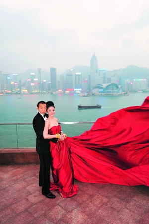 奚仲文說,“kelly想有一套比較夸張的婚紗給記者拍照,碰巧Lusan Mandongus工場肯人手趕制一件,構思是配合洲際酒店的長云石樓梯。頭紗從英國訂過來,長15米左右;婚紗布料則從法國運過來,從最初的12米改成6米多。最初鋪了上千朵牡丹,但鐘珍說999朵好意頭,這衫足足做了一個多月!