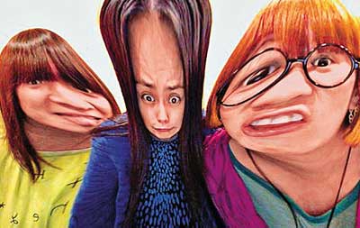 “異形照”中阿嬌一頭黑色長發(fā)身穿藍(lán)色上衣以素顏示人,精神奕奕,她和茜利妹及一女友人在相中面容全部變形及扭曲,阿嬌分別變成大頭妹、及大口怪等,另外她又戴上趣致眼鏡,在相機(jī)面前從容地?cái)[出各種搞笑表情及古靈精怪的樣子,甚至有些笑容燦爛。