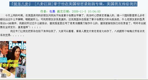 記者近日在國內(nèi)最大的天涯論壇“娛樂八卦”版上看到,有網(wǎng)友貼出“美國雜志報道章子怡要發(fā)片的頭版消息”的帖子,帖子內(nèi)容透露,“章子怡將出首張專輯,還請來了老友公司旗下的5位型男組合A-ONE做伴,曲風(fēng)方面則有麥當(dāng)娜親自制作,據(jù)說現(xiàn)在已經(jīng)在錄音了,明年年出就要在全球發(fā)行!