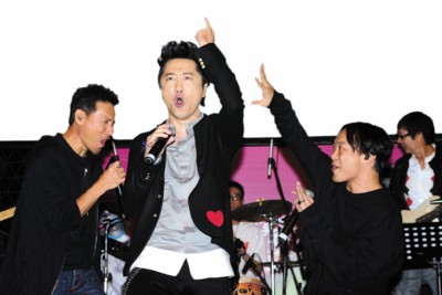 在昨日的發(fā)片會(huì)上,張學(xué)友和陳奕迅新老兩歌神不僅到場(chǎng)助陣,還帶來(lái)了庾澄慶最喜歡吃的巧克力和薯片,寓意他在香港“吃得開(kāi)”。三人特別合唱了《愛(ài)你的只有一個(gè)我》、Rap版《愛(ài)是懷疑》以及搖滾版《吻別》。開(kāi)唱前張學(xué)友打趣說(shuō):“情緒好點(diǎn)了嗎?”陳奕迅還特別提醒在座媒體“留心歌詞”。由于三人的表演非常精彩,有記者發(fā)問(wèn),庾澄慶是否考慮與張學(xué)友和陳奕迅組成一個(gè)類似“縱貫線”的樂(lè)隊(duì),庾澄慶說(shuō):“你剛才看到的表演我們才排練了十分鐘,每一次他們都覺(jué)得哪里加一個(gè)和音會(huì)比較有亮點(diǎn),在他們百忙之下一共合作了三次。我覺(jué)得我們?nèi)齻(gè)首先應(yīng)該有作品,因?yàn)閷W(xué)友馬上就有專輯出來(lái),Eason也正在錄音,把三個(gè)人放在一起表演有困難,如何協(xié)調(diào)才是真的,所以先有歌會(huì)比較好。我們?nèi)齻(gè)中,學(xué)友比較煽情,我比較搖滾,陳奕迅的發(fā)揮很即興,寫(xiě)這首歌的人不一定是我,但是寫(xiě)的人一定會(huì)很過(guò)癮。如果市場(chǎng)反應(yīng)不錯(cuò)的話,可以跟‘貫縱線’拼一下。”