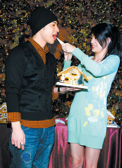 潘瑋柏(左)手不靈活,江語晨代勞喂他吃奶油。