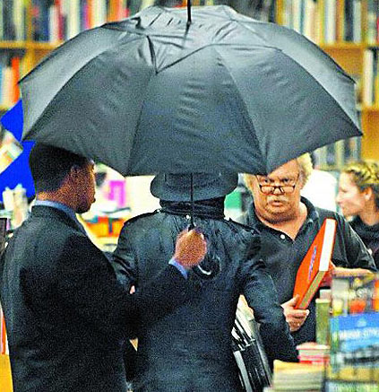 臺灣媒體報(bào)道,當(dāng)日他全副武裝,用巨大口罩遮面,在書店內(nèi)還不忘讓保鏢為其撐傘,詭異行徑因店內(nèi)群眾紛紛駐足觀望。