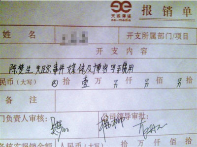 這份報(bào)銷單中,開(kāi)支內(nèi)容一欄寫的是“陳楚生失蹤事件媒體及博客寫手費(fèi)用”,部門負(fù)責(zé)人審核一欄簽有天娛傳媒宣傳總監(jiān)吳夢(mèng)知的名字,公司領(lǐng)導(dǎo)審批則有天娛總經(jīng)理龍丹妮和天娛副總楊柳的簽名。