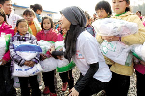 翁虹與丈夫是“中國社工協(xié)會(huì)(兒童希望)救助”的形象大使。上周,他們與志愿者們一起將棉衣、棉被等過冬物資送到四川省綿陽市一些災(zāi)民手中,并提前跟孩子們過年。