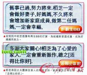 據(jù)報(bào)道,香港某周刊日前爆出張柏芝再度懷孕的消息。據(jù)悉,張柏芝弟弟張豪龍向該周刊轉(zhuǎn)發(fā)了姐弟間的短信,該周刊根據(jù)短信內(nèi)容證實(shí)張柏芝已再度懷孕。另外謝霆鋒媽媽狄波拉接受訪問(wèn)時(shí)也稱,兒媳已經(jīng)開始吃補(bǔ)品再為謝家添丁。