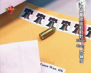 前晚,香港有線(xiàn)電視收到一封寄自美國(guó)的恐嚇信,內(nèi)里除一粒子彈外,還附有一封針對(duì)陳冠希的恐嚇信件,警告他自4月4日后不要再出席任何公開(kāi)活動(dòng),否則將危害其人身安全。昨天,陳冠希的老板林建岳接受記者采訪(fǎng)時(shí)表示,不會(huì)擔(dān)心陳冠希的安危。陳冠希自己也不懼“子彈”,將出席《神槍手》4月在新加坡的首映禮。