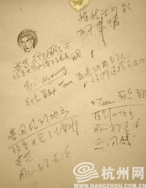和所有的新聞發(fā)布會一樣,劉謙的新聞發(fā)布會也有冗長的各贊助商發(fā)言時間。從臺下看,劉謙在贊助商發(fā)言時間一直很認(rèn)真地在記筆記,而事實上,他和每一個在無聊會議上的人一樣,認(rèn)真地在紙上亂涂亂畫:一個小小的自畫頭像,幾行無意義的漢字,還有一處寫著“No money”,就是這位魔術(shù)師的會議筆記。