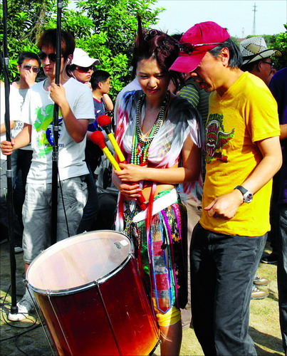 在劇照上,譚維維穿著清涼,再加上混合了各種民族元素的鮮艷裝飾和紋身,火辣的身材暴露無疑。更加令人驚奇是譚維維的發(fā)型,一縷縷火箭般的沖天直發(fā),頗有漫畫卡通人物的感覺。而崔健打造出這般造型,是為了表現(xiàn)未來的風(fēng)格,還是僅僅用于樂隊(duì)的表演,尚不得而知。激烈的鼓樂、動(dòng)感的舞蹈、火辣的裝束、夸張的發(fā)型,崔健譚維維共同打造的這部發(fā)生在2029年的未來成都故事,最終將呈現(xiàn)出一番怎樣的效果,讓人非常期待。