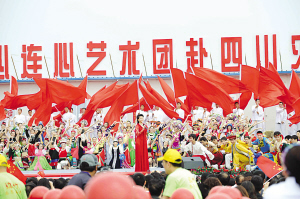 前天上午,為了讓更多的災(zāi)區(qū)人民以及援建志愿者看到演出,“心連心”藝術(shù)團(tuán)專門派出兩支小分隊(duì)赴德陽(yáng)東汽新址以及北川擂鼓鎮(zhèn)舉行分會(huì)場(chǎng)表演,而昨天上午,主會(huì)場(chǎng)的演出則在綿竹上演,上萬(wàn)觀眾觀看了演出。而央視著名主持人趙忠祥、畢福劍、徐俐、韓喬生、李瑞英、王小丫、鞠萍、馬東、朱迅等名嘴擔(dān)綱主持并反串了精彩節(jié)目。孫悅、韓磊、湯燦、張邁、陳小濤等近百位明星為災(zāi)區(qū)群眾獻(xiàn)藝。這樣的陣容的確如之前報(bào)道的一樣,“超過(guò)春晚”。許多災(zāi)區(qū)群眾感動(dòng)地說(shuō):“央視心連心藝術(shù)團(tuán),在地震周年到災(zāi)區(qū)演出,確實(shí)把溫暖送到了我們心里,讓我們對(duì)重建家園更有信心”。
