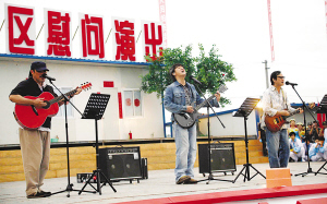得知“心連心”前來演出,不大的擂鼓鎮(zhèn)廣場擠滿了 5000多名從四處趕來的北川人。上午9時,在導(dǎo)演兼主持人馬東的“吆喝”中,央視名嘴王小丫、張澤群、董浩、撒貝寧、韓喬生樂一一亮相,分別為災(zāi)區(qū)人民送上一句祝福。而最難得的場面是平時說比唱多的央視名嘴齊秀唱功。不過最搞笑的當(dāng)屬“韓大嘴”,他一發(fā)聲,調(diào)不知跑哪兒去了,頓時笑翻全場。接下來,鞠萍、趙保樂的《為了誰》,郭峰演唱的《勝利》,孫悅等人演唱的《好人好夢》和觀眾進(jìn)行了臺上臺下的熱烈互動,把現(xiàn)場氣氛推向高潮。