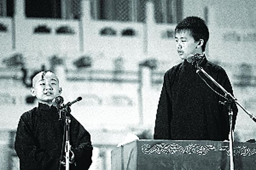 昨晚演出前大會(huì)堂門口的黃牛黨多數(shù)都在收票,演出開場(chǎng)后原價(jià)票依然還有人肯買。演出舞臺(tái)裝飾成天壇的樣子,讓北京觀眾感到相當(dāng)親切。郭德綱兒子郭麒麟和義子陶陽(yáng)開場(chǎng)就說了《學(xué)雜唱》,這個(gè)段子主要表現(xiàn)演員對(duì)各種戲曲唱段掌握程度,比相聲臺(tái)高一點(diǎn)點(diǎn)的郭麒麟不僅將梅葆玖、袁世海等名角唱腔模仿得很像,而且現(xiàn)場(chǎng)還唱起了流行歌曲,此外口才也相當(dāng)了得,不少觀眾感嘆“還是有郭德綱的遺傳基因,天賦不俗!