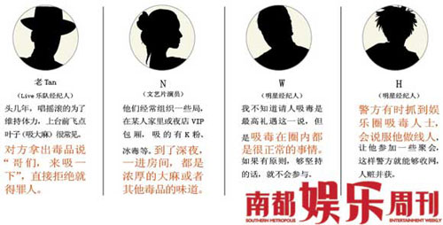 一個手底下帶著以曲藝形式包裝的Live樂隊的經(jīng)紀人老Tan對本報記者透露,自己也曾遇到過這種情況,對方拿出毒品說“哥們,來吸一下”,這個時候,如果你不夠圓滑,直接拒絕就可能得罪對方!叭绻易哌M包房,聞到有什么異樣的味道,我就會待一會兒,趕緊走。如果真躲不過被對方問到,我也會找個理由,比如上廁所或者其他什么的,溜掉?隙ú荒茏寣Ψ接X得我不把他當哥們。當然,這也是一時之計,時間長了,人家也知道你不好這口,干脆就不帶你玩兒了! 也有某經(jīng)紀人W說:“我不知道請人吸毒是最高禮遇這一說,但是吸毒在圈內(nèi)都是很正常的事情。如果有原則,夠堅持的話,就不會參與。我看見有人吸,也會勸勸對方別沾這個。不過圈內(nèi)最正常的玩法還是喝酒和泡妞。”