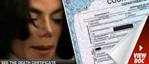 在這份注明2009年7月7日開立的死亡證明書寫著,黑人男性,死者全名為麥可爾‧約瑟夫‧杰克遜(Michael Joseph Jackson),生于1958年8月29日,死于2009年6月25日,終年50歲。