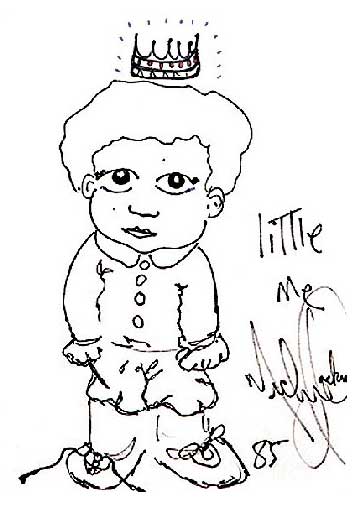 3張自畫像中,其中一張是MJ自繪兒時的樣子,圖中他身材細小頭發(fā)鬈曲,頭戴皇冠十分可愛。
