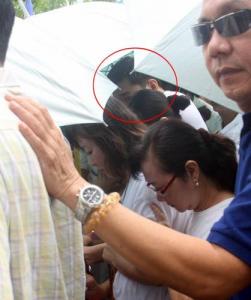 連日來“藏身”朱宅的華仔,在朱父出殯之日終“破功”,雖然他“被逼”出來面對(duì)眾人,但始終嚴(yán)守最后一道防線,朱家親友采用“傘遮人”政策(全體打開雨傘),讓華仔混在親友當(dāng)中,并由一名高大印裔保鏢擋在其身邊,一直用手壓低華仔的頭,讓他由頭到尾“沒臉見人”。