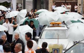 報(bào)道指出,今日(周六,8月22日)早上約10時(shí)15分,朱父正式封棺儀式并準(zhǔn)備抬上靈車,從朱宅傳出不少號(hào)哭聲。直至11時(shí)30分,朱父靈柩在殯儀隊(duì)奏樂開路下,從朱家緩緩駛出。走在前頭的是朱家幼女朱麗華的夫婿顏華潤,他在多名親友的雨傘下,企圖以“聲東擊西”的情況引開攝影鏡頭,借此混淆視聽,而大批媒體、攝影記者圍睹上去閃光燈閃不停,使殯儀隊(duì)伍行駛緩慢。
