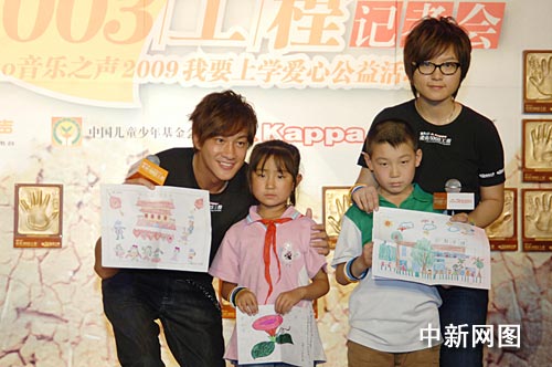中新網(wǎng)9月3日電(蒲波) 3日下午,2009年中央人民廣播電臺MusicRadio音樂之聲“我要上學(xué)——愛的5003工程”大型主題公益活動在北京798藝術(shù)區(qū)圣之藝術(shù)中心舉行記者會,音樂之聲“愛心大使”何潤東牽手河北省豐寧滿族自治縣鄧柵子小學(xué)的小東楠姑娘亮相。