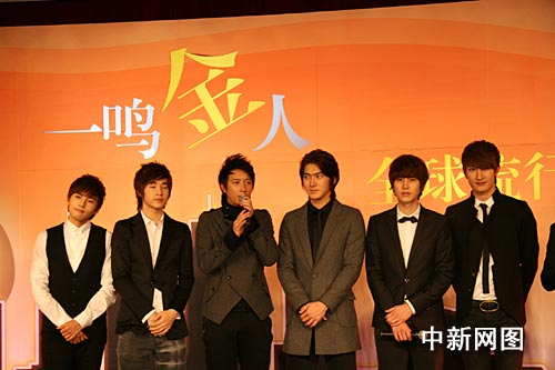 16日,“一鳴金人—全球流行音樂金榜新聞發(fā)布會(huì)”在北京召開。為了呼應(yīng)“一鳴金人”主題,新聞發(fā)布會(huì)現(xiàn)場(chǎng)被裝點(diǎn)得金光閃耀!翱炫惫谲娊橙?zé)崂遍_場(chǎng),以一曲為金榜精心改編的動(dòng)感舞曲引爆全場(chǎng)。隨后,光良與超人氣偶像團(tuán)體Super Junior—M,以“全球組”組合形式搭配現(xiàn)身,他們分別準(zhǔn)備了“金色地球儀”和“金色筆記本電腦”作為禮物,并表示送這份禮物的意義在于未來全球流行音樂金榜將聯(lián)合全球各地中文電臺(tái)的力量,共同為華語(yǔ)流行樂壇弘揚(yáng)與發(fā)展努力。身為流行樂壇中的一員,光良和Super Junior-M現(xiàn)場(chǎng)詮釋了音樂是無(wú)國(guó)界的,并分別清唱了各自的代表作。
