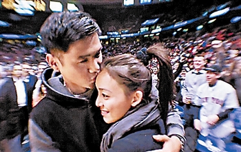 今年春節(jié),陳建州與女友范瑋琪選擇在紐約共度,同時(shí)受好友易建聯(lián)之邀,兩人去新澤西觀看北京時(shí)間2月18日上午進(jìn)行的籃網(wǎng)與熱火的比賽。中場休息時(shí),“黑人”陳建州突然起身,掏出一枚鉆戒向女友求婚,范瑋琪含淚答應(yīng),兩人結(jié)束十年愛情長跑。陳建州多年來一直想“伺機(jī)”求婚,但一直太緊張而未敢有“妄為”。這次,非常喜歡籃球的他認(rèn)為籃網(wǎng)主場是一個(gè)好機(jī)會(huì),于是大膽表白。籃球場邊的美國人看到這一幕,也跟著一起歡呼叫好,并不停地喊著“易”,呼喚易建聯(lián)參加好朋友的求婚“儀式”。靦腆的阿聯(lián)一邊微笑,一邊鼓掌,見證這對好友的幸福時(shí)刻。