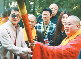 中新網(wǎng)10月23日電 劉德華將在新片《新少林寺》中拜成龍為師學(xué)功夫!昨天河南少林寺的寧靜被打破,宣揚武術(shù)精神的《新少林寺》開鏡,成龍、劉德華、謝霆鋒、范冰冰、吳京齊聚少林寺,現(xiàn)場貴賓、武校學(xué)生見到巨星全變粉絲,拚命圍上前來,場面一度失控,成龍則發(fā)揮大哥本色指揮現(xiàn)場,呼吁大家維持秩序。