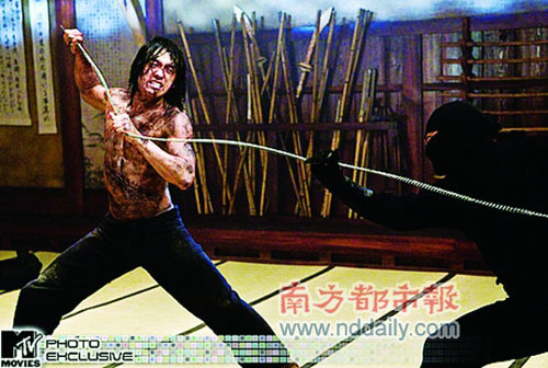 在《極速賽車手》中只是簡單客串,《忍者刺客》才是Rain主演的第一部好萊塢影片。首次挑起大梁,R ain“拼死拼活”。據(jù)他介紹,整部電影中九成以上的危險動作都是他親自上陣,“每天都拿著真正鋒利的刀在拍攝,8個月下來沒有毀容實在是萬幸。每天都很‘痛’很‘苦’,就差骨折了,天天都是青一塊紫一塊。”從劇照上還可以看到他為角色練就的一身肌肉。