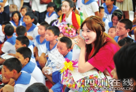 昨日上午,林志玲領(lǐng)銜,曾寶儀、光良、江美琪、許慧欣、謝娜、譚維維、胡彥斌、弦子、楊紫等走進(jìn)了嶄新的“安康家園”棠湖小學(xué),這里生活著幾百名因地震受創(chuàng)的孩子。而在校區(qū)食堂,一個(gè)簡(jiǎn)單隆重的“愛在傳遞”安康家園兒童心系臺(tái)灣小朋友活動(dòng)正在舉行,60余位小朋友看著電視上的大明星來到了他們身邊,都非常興奮,還獻(xiàn)上了潔白的哈達(dá)。