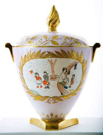 李亞鵬在2009年度嫣然天使基金慈善晚宴新聞發(fā)布會(huì)上表示,晚宴現(xiàn)場(chǎng)拍賣(mài)所需的藝術(shù)品已基本到位。其中,最吸引眼球的拍品無(wú)疑就是由兩位“潛力藝術(shù)家”竇靖童、李嫣聯(lián)手設(shè)計(jì)的Wedgwood-Trophy Vase(瑋致活—?jiǎng)倮?精致骨瓷。據(jù)悉,Wedgwood是英國(guó)傳統(tǒng)陶器品牌,竇靖童、李嫣為T(mén)rophy Vase所創(chuàng)作的這一設(shè)計(jì),取材于一家人融洽相處的畫(huà)面,表現(xiàn)出小孩眼中的溫馨家庭氛圍和每個(gè)人都渴望得到的關(guān)愛(ài)。