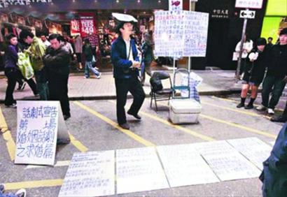 日前,在旺角行人專用區(qū),一位中年男子在頭上圍上“我愛(ài)容祖兒公主”的紙牌,帶著紅白藍(lán)膠袋、兩張折椅等做道具,當(dāng)街展示多張求愛(ài)紙牌。