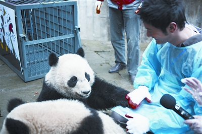 1月5日,“中國(guó)保護(hù)大熊貓研究中心熊貓愛(ài)心大使“黃曉明到雅安現(xiàn)場(chǎng),替自己的一雙“兒女”送行。由他百萬(wàn)認(rèn)養(yǎng)的地震后出生的全球首對(duì)雙胞胎大熊貓“平平”、“安安”這次就將以“哥哥”、“姐姐”的身份帶領(lǐng)另外八只熊貓遠(yuǎn)赴上海世博。“平平”似乎一眼就認(rèn)出了“爸爸”,邊吃著早餐,另一只手很自然的就搭在了黃曉明的腿上。 記者 黃麗娟