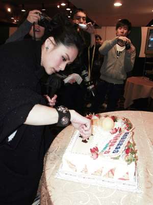 粉絲們得悉阿嬌近日忙于拍戲及籌備新專輯,特意送上寫有祝福阿嬌歌影事業(yè)順利的蛋糕。但粉絲又得知阿嬌曾學做蛋糕,對蛋糕要求甚高,故特別設計了一個既可表達粉絲們心意,又能讓阿嬌可即場簽名及自由創(chuàng)作,使兩者心思合二為一的精致蛋糕。