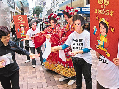 至于香港的蘇珊大媽粉絲也不甘示弱,近日戴起面具兼穿上“愛珊Tee”向途人大派“蘇珊財(cái)神”,代偶像祝港人今年財(cái)源滾滾。有關(guān)方面也推出了賀年新春限量版CD應(yīng)節(jié),附送蘇珊“心想事成”紅包10個(gè),以配合唱片主題“我有個(gè)夢(mèng)想”。