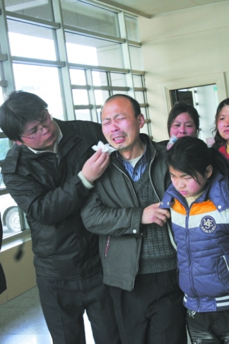 自從醫(yī)院方面向王成記透露李榮珍的病情繼續(xù)惡化后,一向很堅(jiān)強(qiáng)的王成記仿佛老了10歲。雖然昨日換了一身干凈衣服,可是王成記兩眼無(wú)光,還沒(méi)走近重癥監(jiān)護(hù)室已哭得死去活來(lái)。因?yàn)橹匕Y監(jiān)護(hù)室每次只能進(jìn)兩個(gè)人,所以王成記的女兒、兒子以及親朋好友進(jìn)去后,王成記才一個(gè)人走了進(jìn)去。剛走到妻子的病床前,這個(gè)男人一下跪了下去,握緊著李榮珍的右手,淚流滿面!澳憧禳c(diǎn)醒來(lái),兩個(gè)娃娃還等著你,你不要睡了……”王成記的哭聲,讓現(xiàn)場(chǎng)的每個(gè)人都感到很難過(guò)。盡管媒體昨天報(bào)道李榮珍已經(jīng)腦死亡,但王成記表示醫(yī)院并沒(méi)有向他出示腦死亡的證明,雖然他也表示妻子生存的幾率很小。王成記與家人商量后,表示將繼續(xù)醫(yī)治妻子,希望能夠出現(xiàn)奇跡。